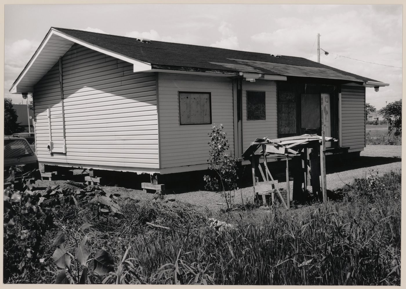 Field Work in Montreal: View of a wooden shack-like structure and a house on blocks, Montréal, Québec