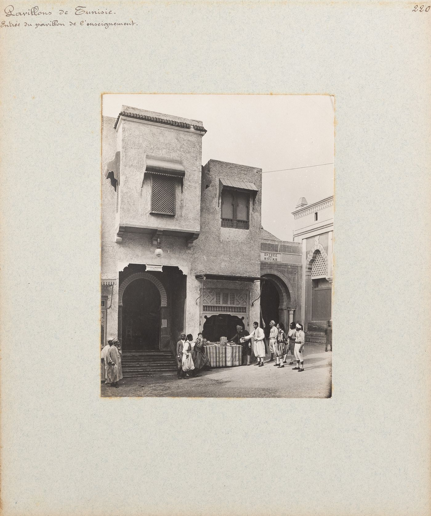 inscribed - recto: Pavillons de Tunisie. Entrée du pavillon de l'enseignement (on mount, upper left, in unknown hand, in black ink); 220 (on mount, upper right, in unknown hand, in black ink)