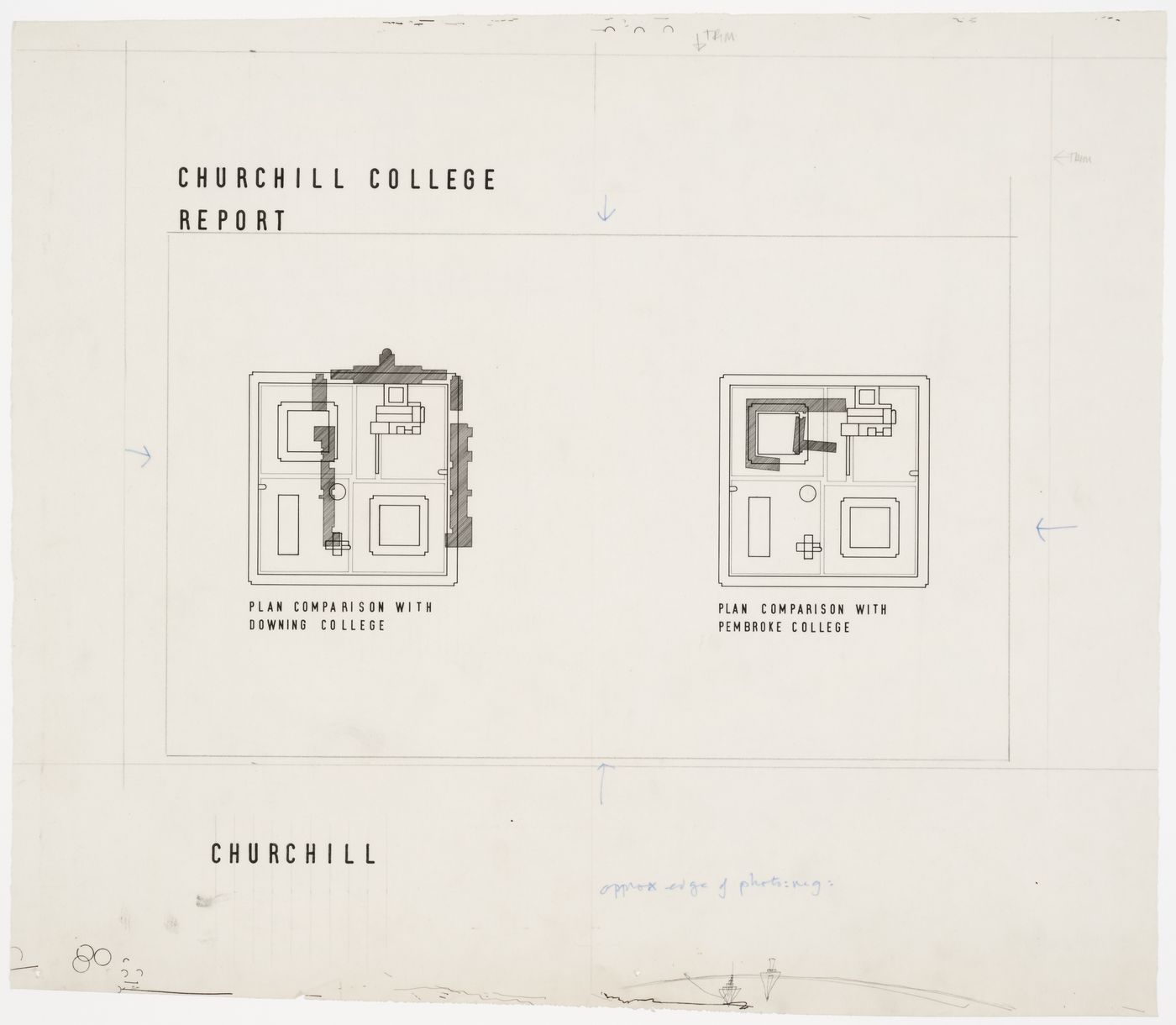 Two diagrammatic plans showing the comparative sizes of the projected main buildings for Churchill College and other existing Colleges in Cambridge, Churchill College, University of Cambridge, Cambridge, England