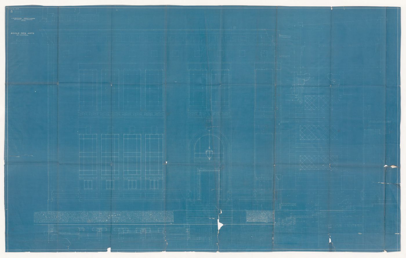 Élévation avec plan et coupe de l'entrée pour École des Arts de Montréal