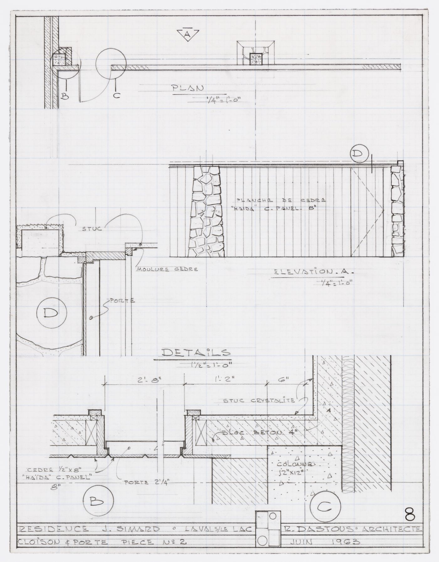 Plan, élévation et détails d'une cloison et porte pour Résidence Jean Simard, Laval-sur-le-Lac, Québec