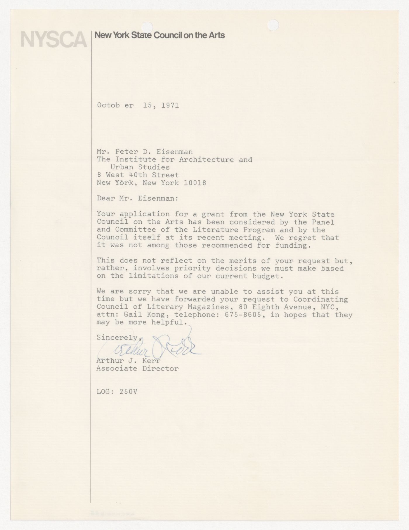 Letter from Arthur J. Kerr to Peter D. Eisenman about a grant from the New York State Council on the Arts (NYSCA)