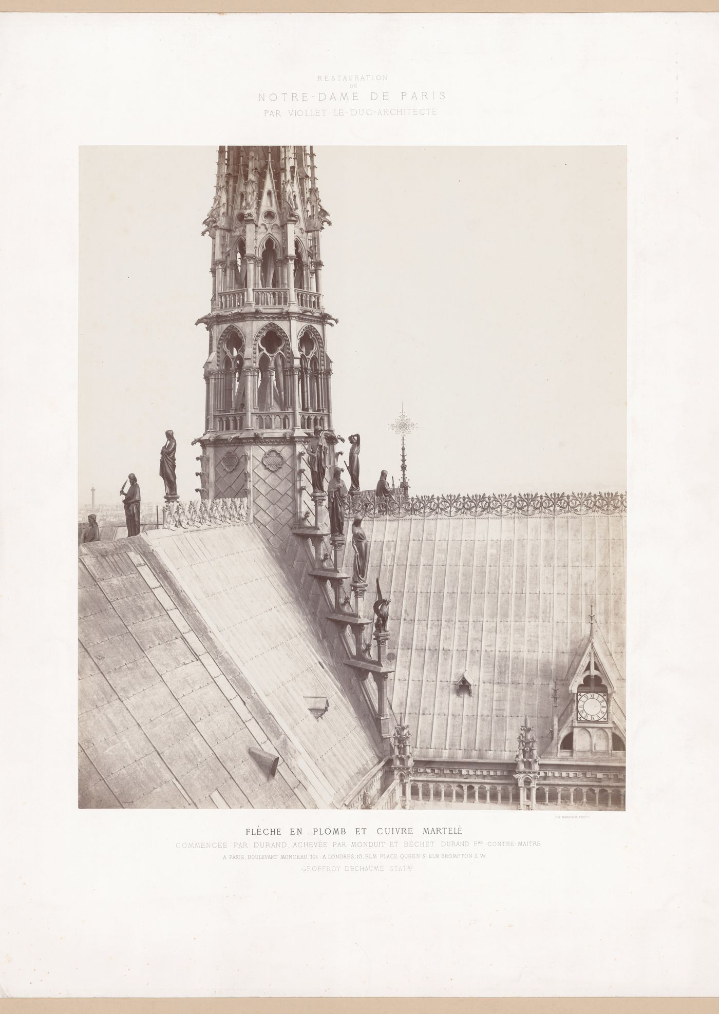 inscribed - RESTAURATION / DE/ NOTRE-DAME DE PARIS/ PAR VIOLLET LE-DUC-ARCHITECTE/ FLÈCHE EN PLOMB ET CUIVRE MARTELÉ/ COMMENCÉE PAR DURAND, ACHEVÉE PAR MONDUIT ET BÉCHET DURAND FRE. CONTRE-MAITRE/ A PARIS, BOULEVARD MONCEAU, 104. A LONDRES, 10, ELM PLACE QUEEN'S ELM BROMPTON S.W./GEOFFROY DECHAUME STATRE. (printed on mount, above and below the composition,C); CH. MARVILLE PHOTO. (printed on mount, below composition, LR); rec(written in pencil, in unknown hand, verso, LR); 9850 (written in pencil, in unknown hand, verso, UR)