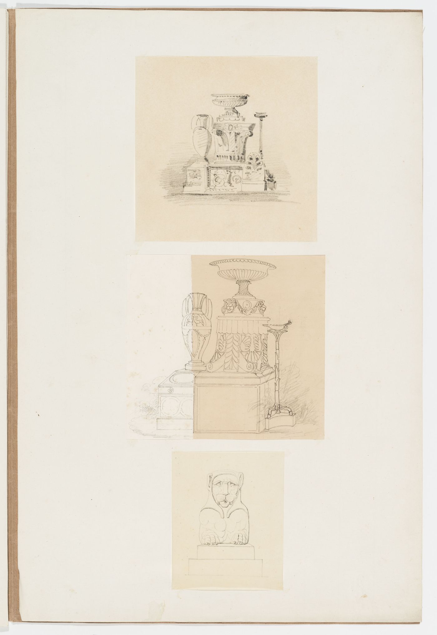 Sketches of vases, capitals and pedestals; Sketch of a sculpture [?] of a mythical animal