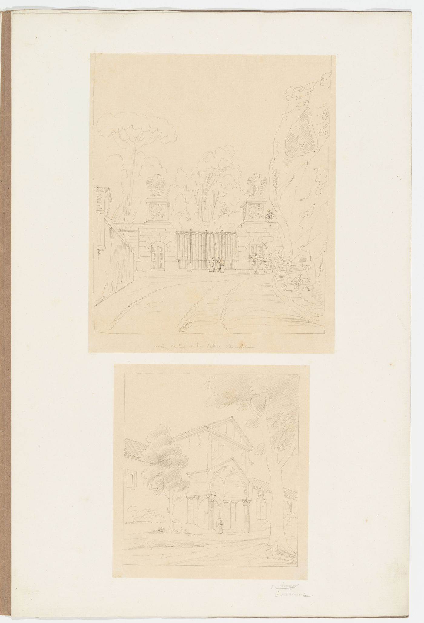 View of the entrance to Villa Borghese, Rome; View of an unidentified building