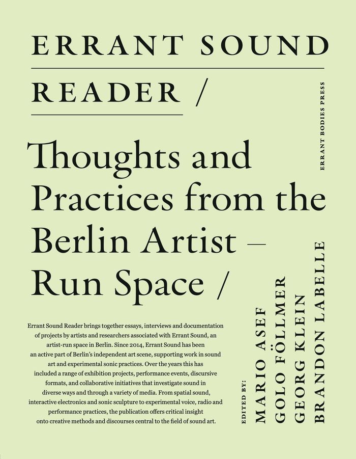 ''Errant Sound Reader'' brings together essays, interviews and documentation of projects by artists and researchers associated with ''Errant Sound'', an artist-run space in Berlin. Since 2014, Errant Sound has been an active part of Berlin's independent art scene, supporting work in sound art and experimental sonic practices. Over the years this has included a range of exhibition projects, performance events, discursive formats, and collaborative initiatives that investigate sound in diverse ways and through a variety of media. From spatial sound, interactive electronics and sonic sculpture to experimental voice, radio and performance practices, the publication offers critical insight onto creative methods and discourses central to the field of sound art.