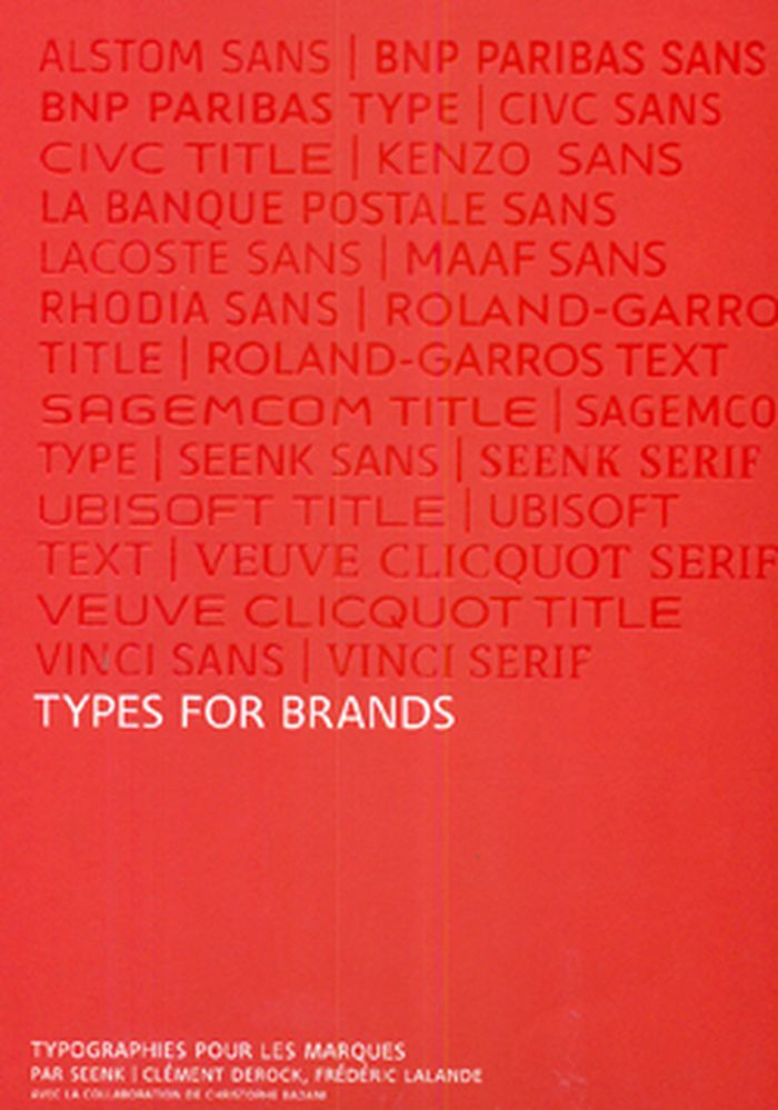 Types for brands / Typographies pour les marques est un recueil de polices de caractères identitaires créées spécifiquement à l'usage des marques dans le cadre de leur communication. L'ensemble des polices a été conçu par l'agence de design parisienne Seenk pour ses clients. De la conception à l'utilisation finale, ce livre donne à voir une collection d'alphabets propriétaires dessinés pour l'ensemble des communications des annonceurs utilisant leur propre "police d'accompagnement" et dont l'originalité du dessin est partie prenante de leur identité visuelle. Cet ouvrage démonstratif et pédagogique a également pour vocation de faire la lumière sur une pratique souvent réservée à des initiés : la création typographique, et ce grâce à une quinzaine d'études de cas largement illustrées consacrées aux plus grandes marques.